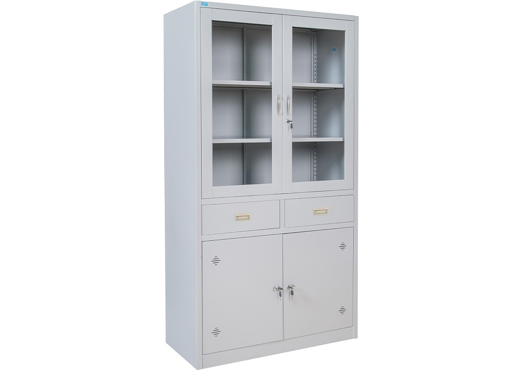 Tủ sắt sơn tĩnh điện: Khoang trên cùng có 2 đợt di động, khung cánh kính mở. Khoang giữa gồm 2 ngăn kéo và khoang dưới cùng có 2 cánh sắt mở.