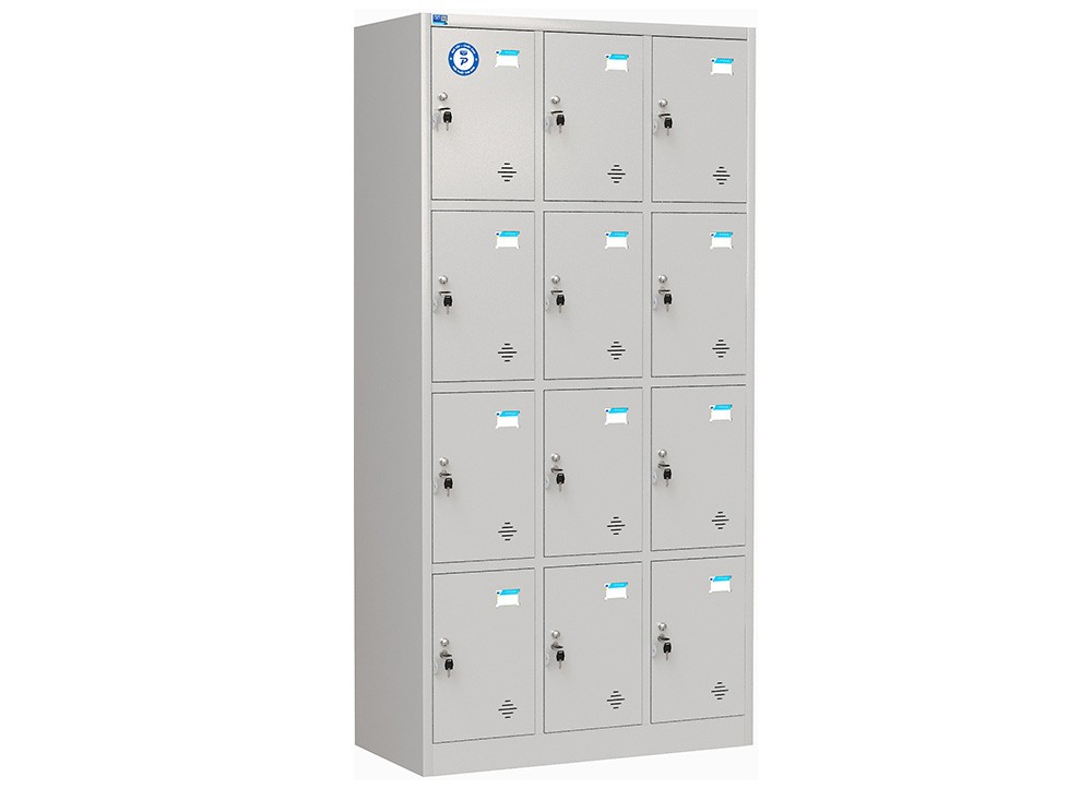 Tủ sắt sơn tĩnh điện 12 khoang cánh mở. Trên mỗi cánh có 1 khóa Locker, núm tay nắm và tai khóa móc.