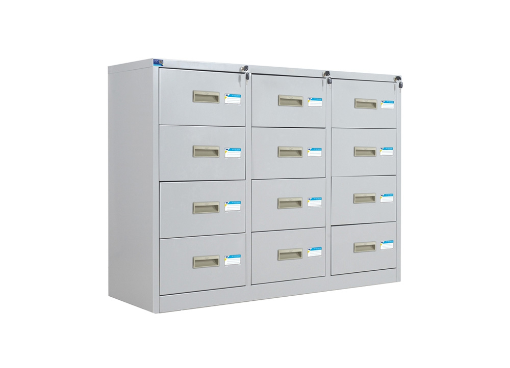 Tủ sắt sơn tĩnh điện gồm 3 khoang, mỗi khoang có 4 ngăn kéo, dùng chung 1 thanh khóa dàn.