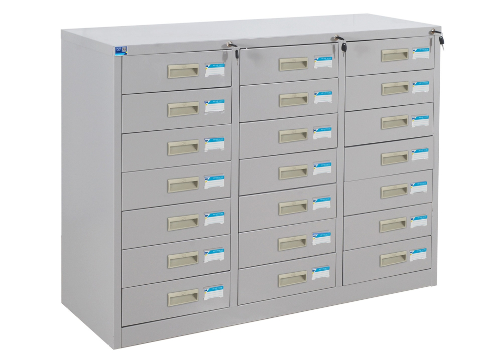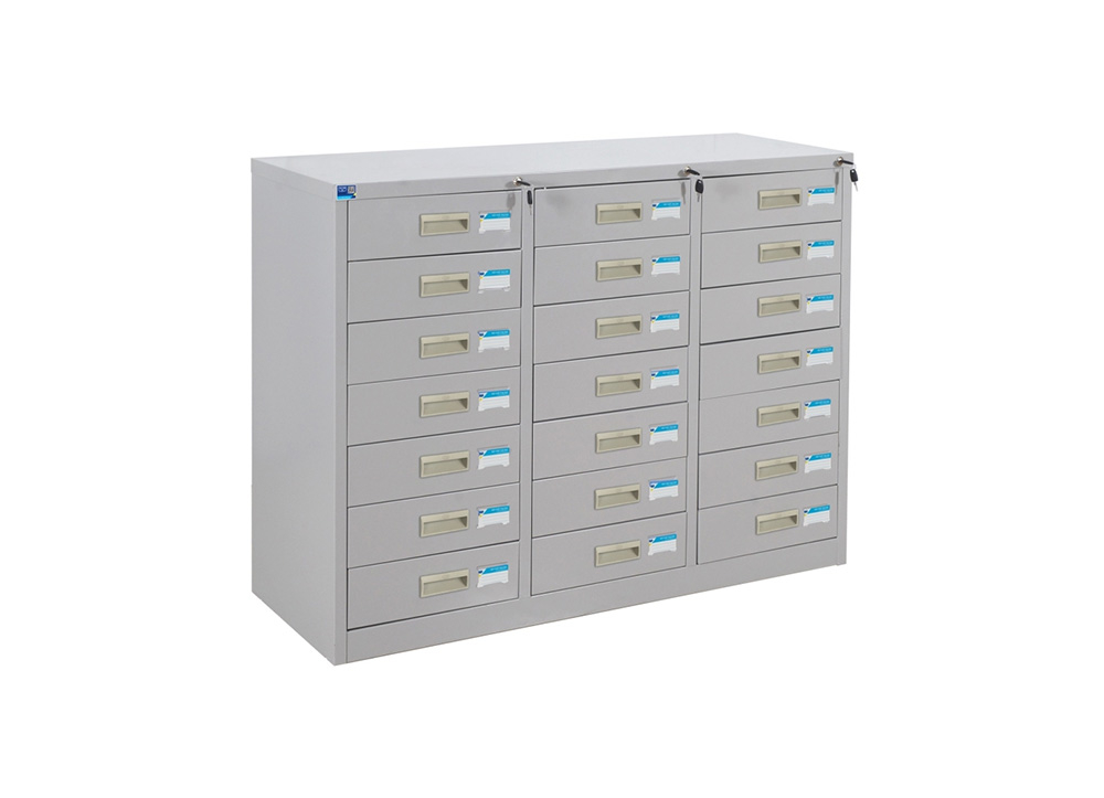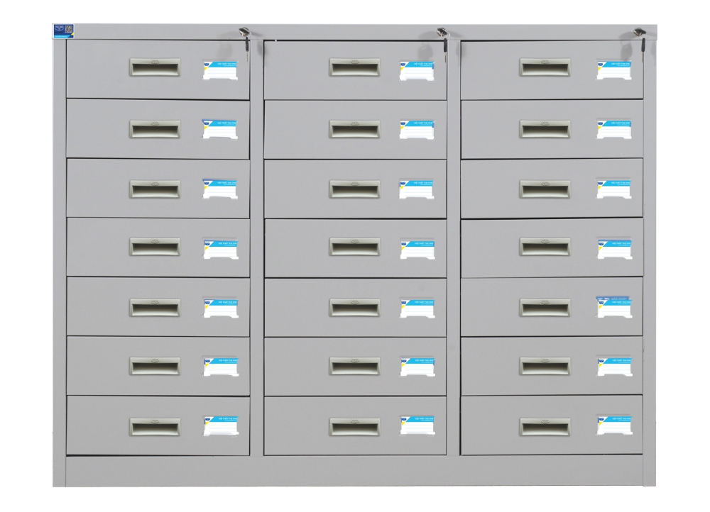 Tủ sắt sơn tĩnh điện gồm 3 khoang, mỗi khoang có 7 ngăn kéo, dùng chung 1 thanh khóa dàn.