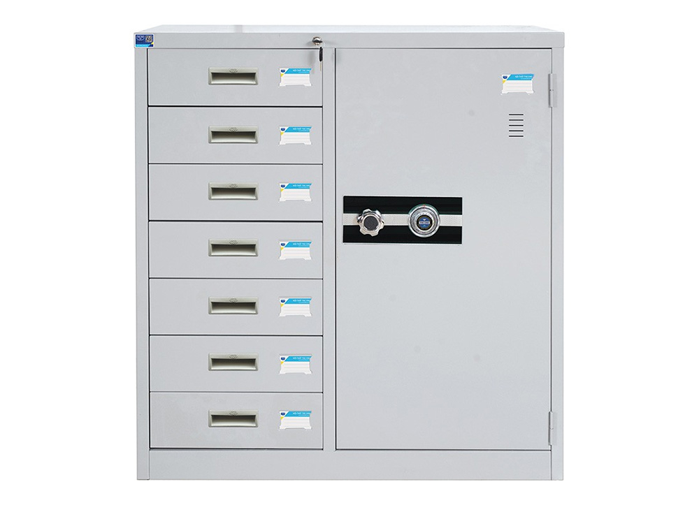 Tủ sắt sơn tĩnh điện 2 khoang: Khoang cánh sắt mở có 1 khóa mã, bên trong có 2 đợt di động. Khoang 7 ngăn kéo sử dụng chung 1 thanh khóa dàn.