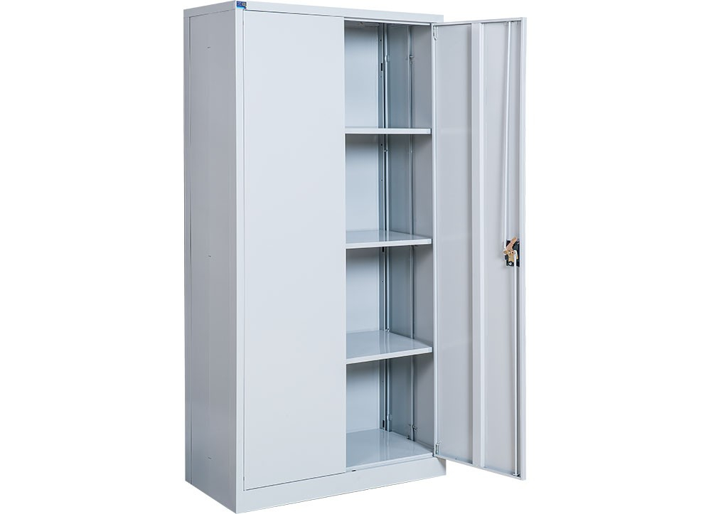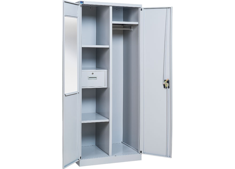Tủ khung thép sơn tĩnh điện gồm hai khoang: 1 khoang có hai đợt cố định và một ngăn kéo, bên trong cánh có thể gắn gương. 1 khoang có một đợt cố định và suốt treo quần áo.