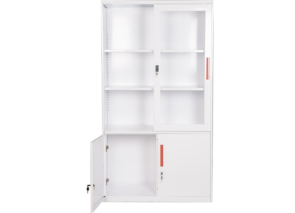 Tủ có khoang trên cánh kính, gồm 02 đợt di động và 02 khoang dưới dạng cánh mở.