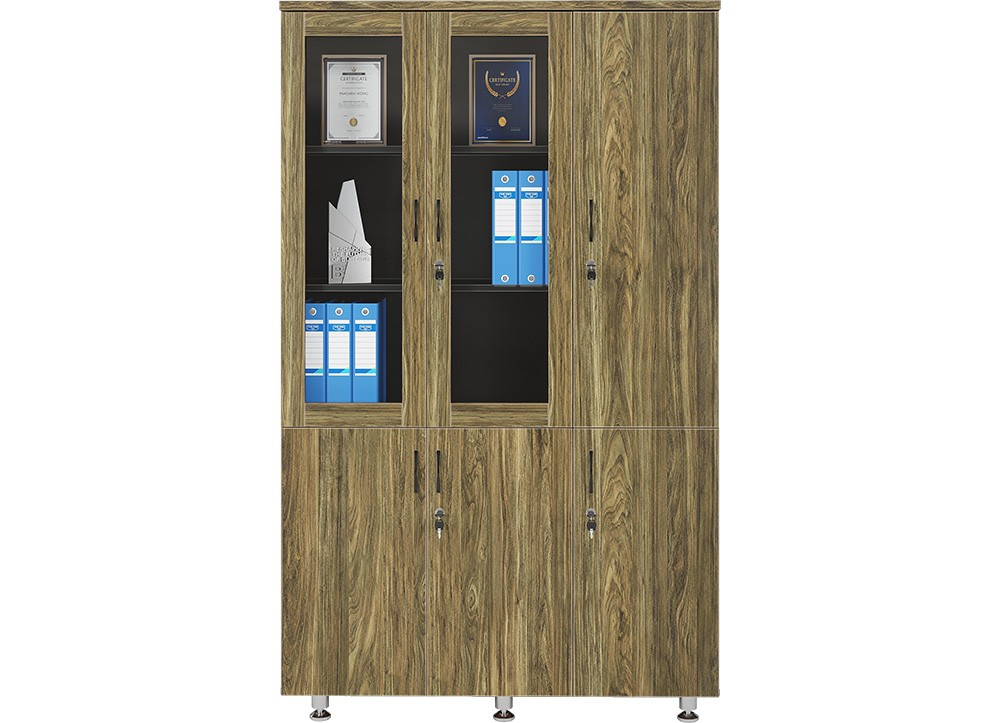 Tủ tài liệu 3 khoang gỗ Melamine, phía trên gồm 2 khoang khung cánh khung kính để tài liệu, 1 khoang cánh gỗ bên trong có suốt treo áo, phía dưới có 3 cánh mở