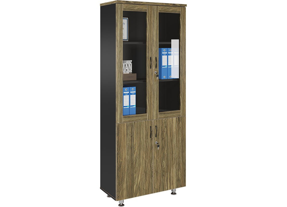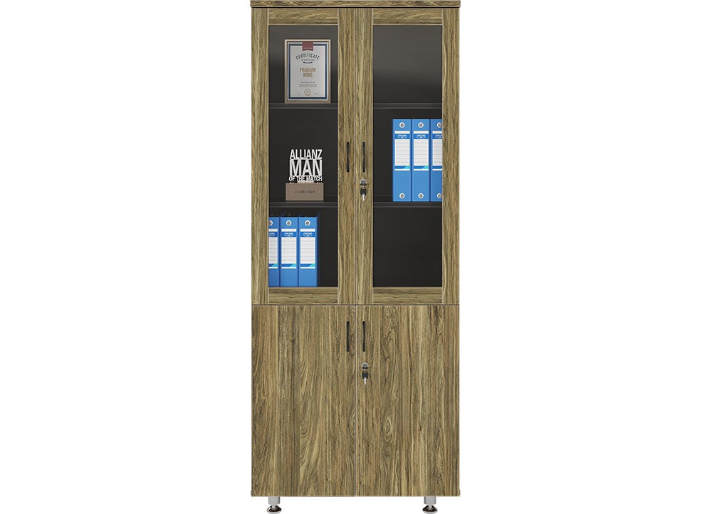 Tủ tài liệu gỗ Melamine 2 buồng gỗ melamine, phía trên là 3 cánh khung kính để tài liệu, phía dưới là hai khoang cánh mở.