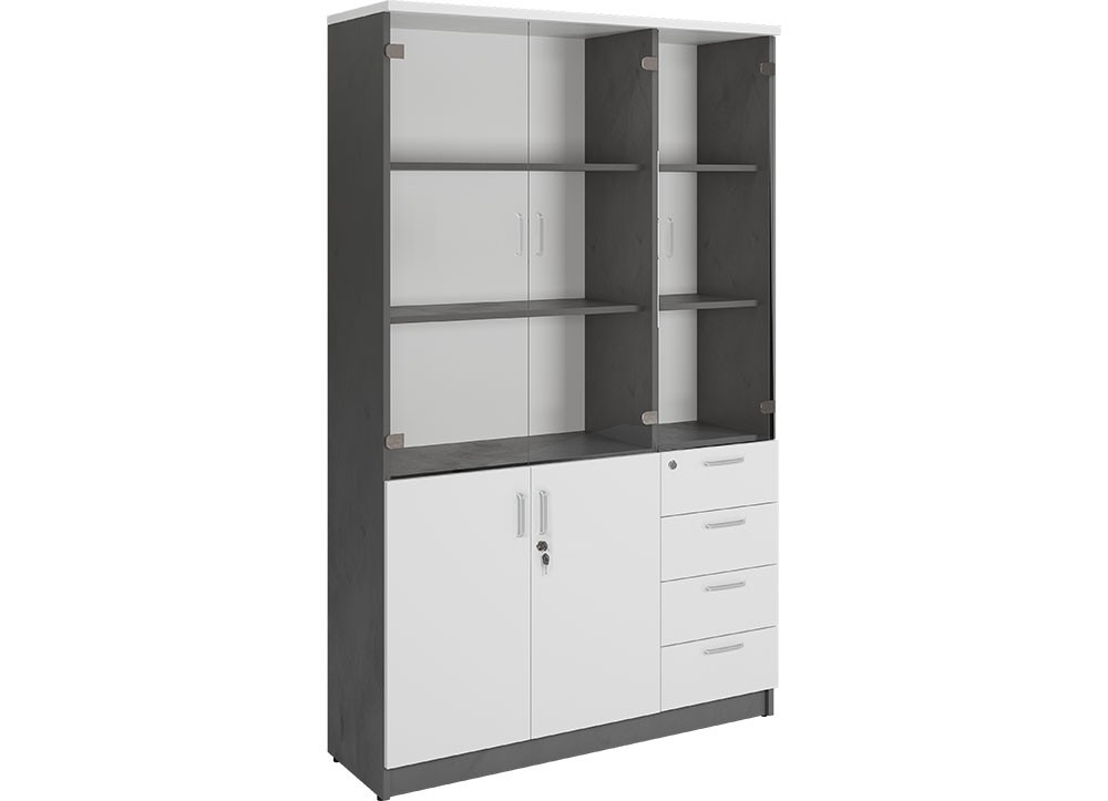 Tủ văn phòng 3 buồng gỗ Melamine, phía trên có 3 cánh kính, phía dưới có 2 cánh gỗ mở và ngăn kéo để đồ