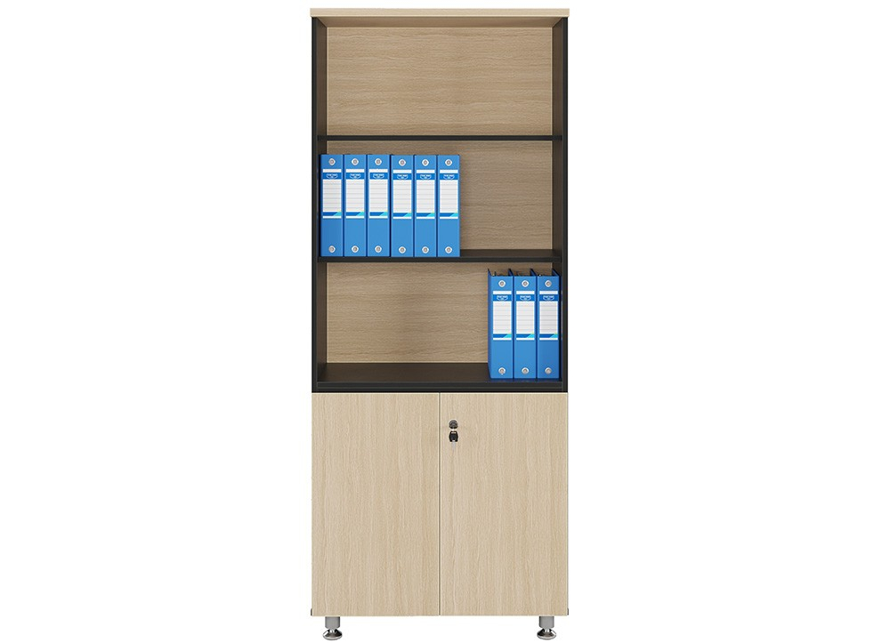 Tủ tài liệu gỗ melamine phía trên có 3 ngăn để file, phía dưới có 2 khoang cánh mở. Sử dụng tay nắm vát cạnh và có khóa.