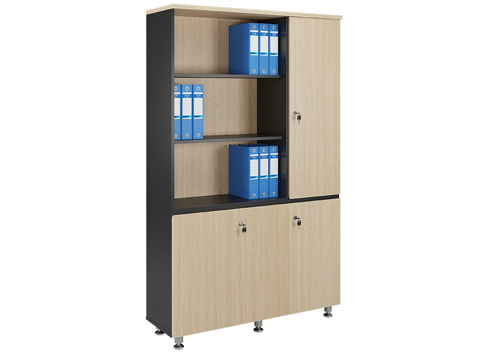Tủ tài liệu 3 khoang gỗ Melamine, phía trên có 3 khoang tài liệu không cánh và 1 khoang treo áo, phía dưới có 3 khoang cánh mở và có khóa.