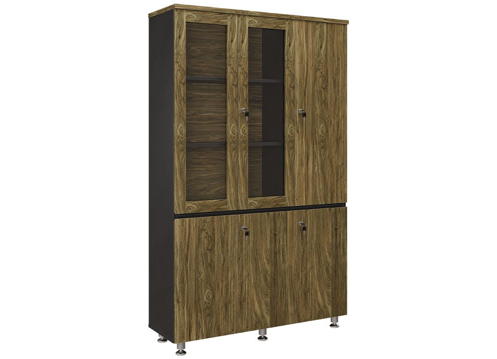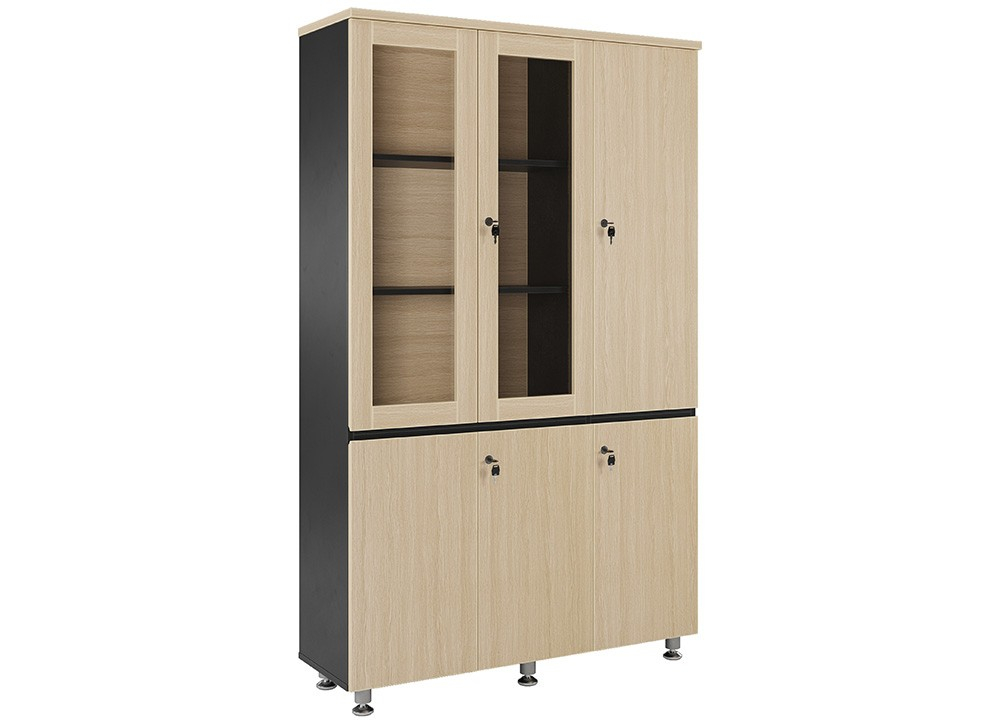Tủ tài liệu 3 buồng gỗ Melamine, phía trên gồm 2 khoang khung cánh kính để tài liệu, 1 khoang cánh gỗ có suốt treo áo, phía dưới có 3 cánh mở.