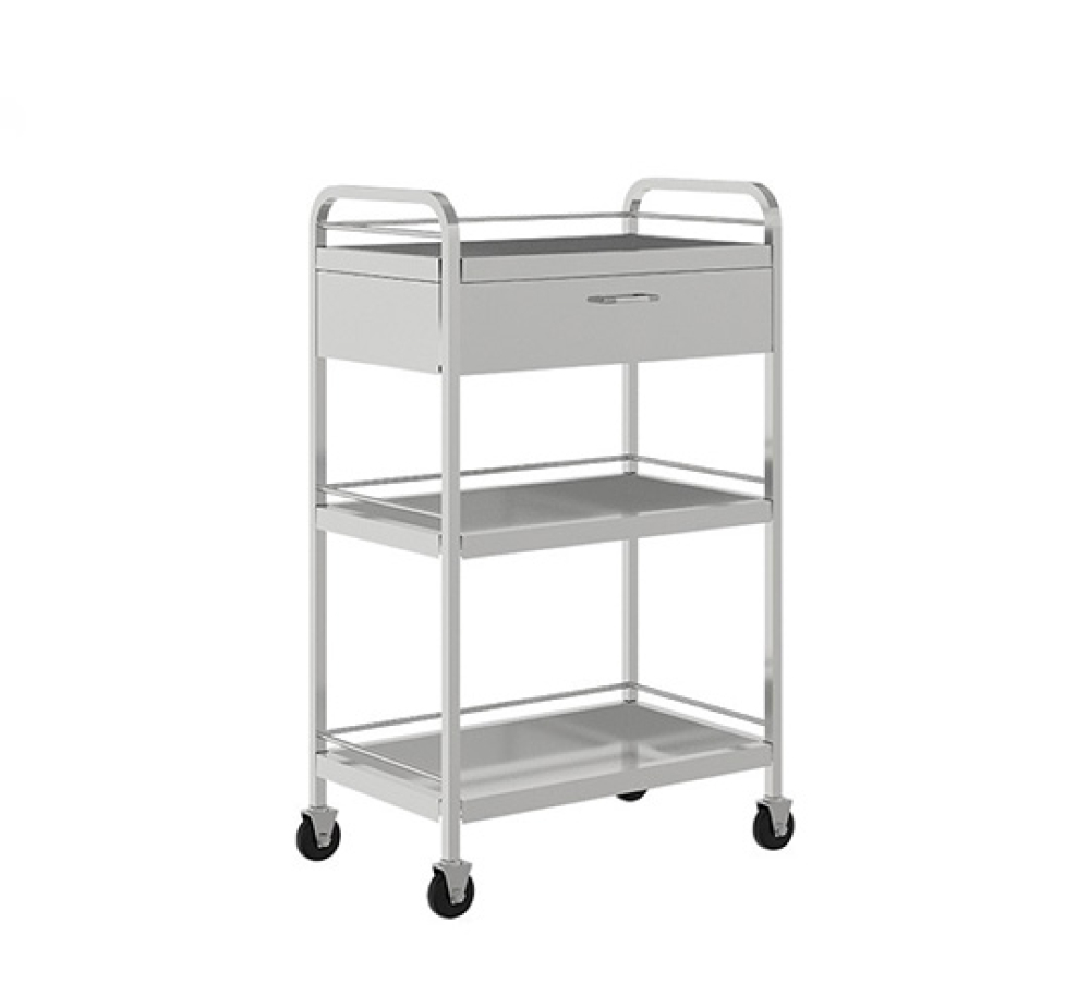 Xe tiêm 3 tầng, chất liệu Inox toàn bộ, xe gồm có 02 khay & 01 ngăn kéo để đồ. Xe có bánh xe di chuyển,